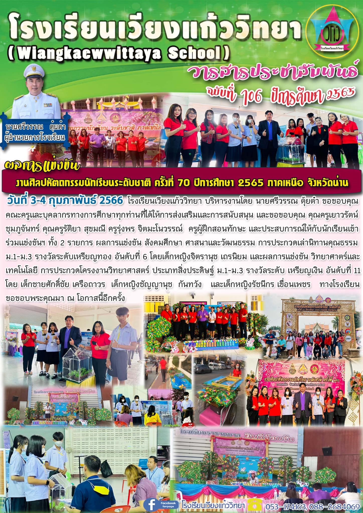 โรงเรียนเวียงแก้ววิทยา บริหารงานโดย นายศรีวรรณ ตุ้ยต๋า ขอขอบคุณคณะครูและบุคลากรทางการศึกษาทุกท่านที่ได้ให้การส่งเสริมและการสนับสนุน และขอขอบคุณคุณครูเยาวรัตน์ ชุมภูจันทร์ คุณครูรัติยา สุขมณี ครูรุ่งพร จิตมะโนวรรณ์ ครูผู้ฝึกสอนทักษะและประสบการณ์ให้กับนักเรียนเข้าร่วมแข่งขันฯ ทั้ง 2 รายการ ผลการแข่งขัน สังคมศึกษา ศาสนาและวัฒนธรรม การประกวดเล่านิทานคุณธรรม ม.1-ม.3 รางวัลระดับเหรียญทอง อันดับที่ 6 โดยเด็กหญิงจิตรานุช เถรนิยม และผลการแข่งขัน วิทยาศาตร์และเทคโนโลยี การประกวดโครงงานวิทยาศาสตร์ ประเภทสิ่งประดิษฐ์ ม.1-ม.3 รางวัลระดับ เหรียญเงิน อันดับที่ 11 โดย เด็กชายศักดิ์ชัย เครือถาวร เด็กหญิงชัญญานุช กันทวัง และเด็กหญิงรัชนีกร เขื่อนเพชร ทางโรงเรียนขอขอบพระคุณมา ณ โอกาสนี้อีกครั้ง